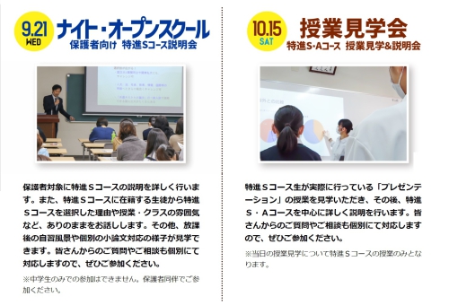 「ナイト・オープンスクール」の特徴は、特進Sコースについて詳しく説明するだけでなく、在籍する特進Sコース1・2年生にも協力してもらい、特進Sコースを受験した理由や授業・クラスの雰囲気など、直接聞けることです!