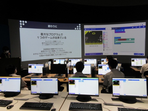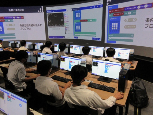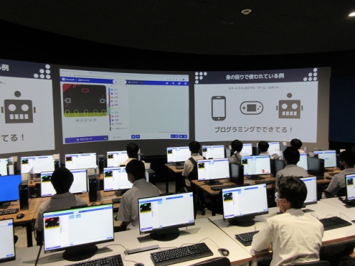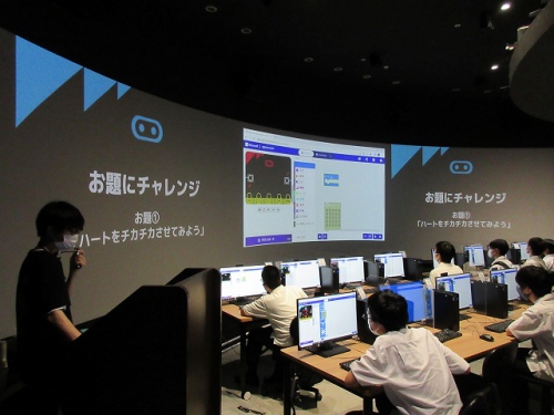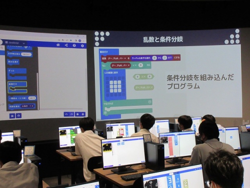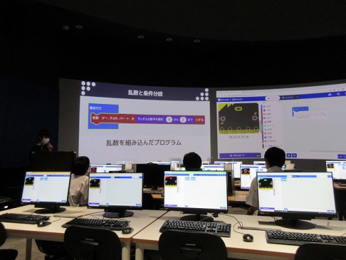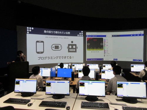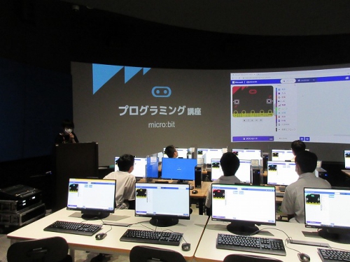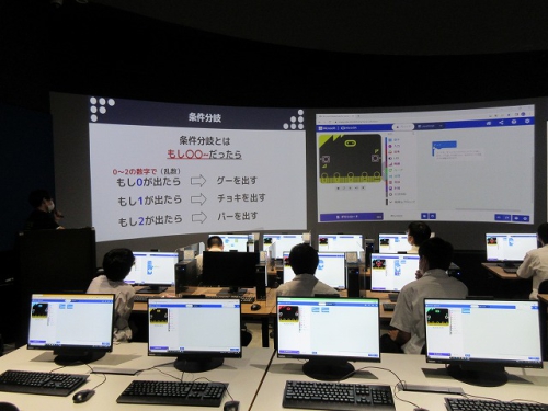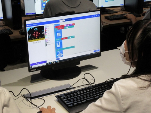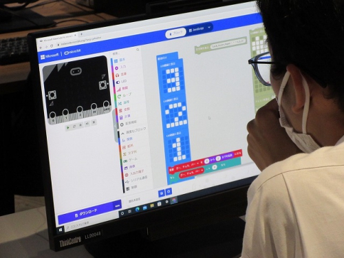 参加した生徒は「マイクロビット」を使い「ハートの点滅」「花火の作成」、乱数を用いた「じゃんけん」を作成しました。プログラミングは一種類だけではなく何通りも考えることができることを体感し、お互いのプログラミングを共有しながら、次々と新しいプログラムを組んでいました。