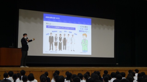 「未来の夢の見つけ方」「今後の進路の決め方」「未来を想像してみよう」「”自ら課題を発見し、解決していく力”ってどんなことだろう?」「未来に向けて今から大切にしたいこと」など、ご自身の経験談を踏まえ、キャリア教育的アプローチで話を展開されました。