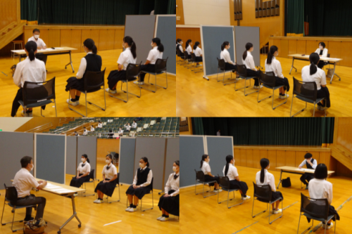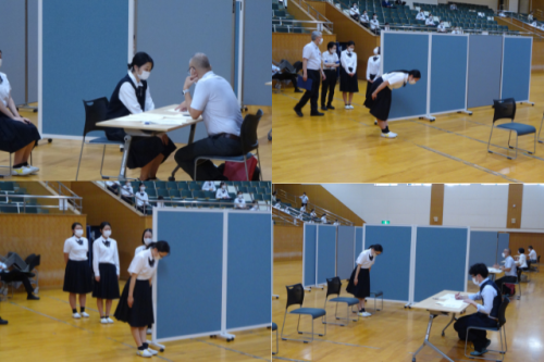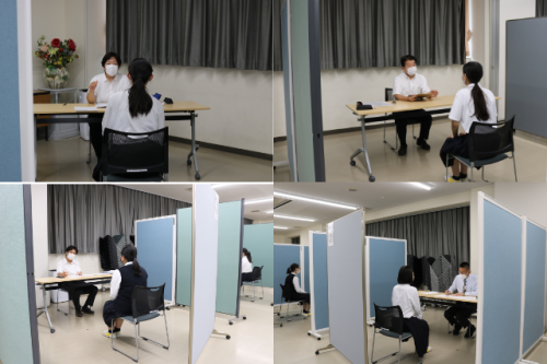 9月3日(土)午前中には、全コースの3年生就職希望生徒を対象に外部講師の方をお招きし、講堂では模擬面接会が実施されました。生徒は本番さながらの雰囲気の中で緊張感をもってグループ面接に挑戦し、入室から退室までの中で姿勢や身だしなみ、喋り方や受け答えなどについて評価を受け、そのフィードバックをもとに自分の面接を振り返りました。