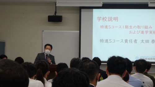説明会は学校長のあいさつから始まり、副校長からはリアルな現状や実績を中心に、生徒数、進学実績、受験対策、英語教育、部活動について、教員の紹介や日々の様々な取り組みなども含めてお話しさせていただきました。続いて特進Sコース責任者から今春卒業し、筑波大、横国大などに進学した特進Sコース1期生の取り組みと進路実績について、入試広報部部長から令和5年度入学試験についての詳細、塾担当者のあいさつ、最後に質疑応答で説明会は終了しました。