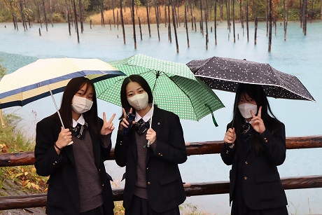 お待ちかねの「旭山動物園」でしたが、残念ながら雨でした。傘での見学となりましたが、マリンウェイ(円柱水槽)で泳ぐアザラシやかわいらしい動物たちの写真を撮ったり、売店でお土産を買ったりと元気いっぱいに過ごすことができました。