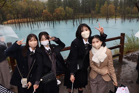 旭川のホテルで卓盛メニューのお肉メインの昼食を食べ、青い池の観光後、トリックアート、ファーム富田の2つに分かれて、それぞれのコースを堪能しました。大雪山旭岳ロープウェイは天候の影響で運休となりました。