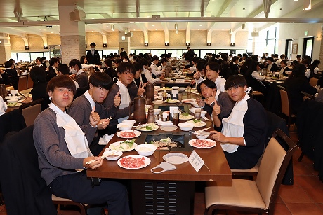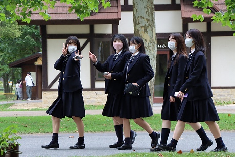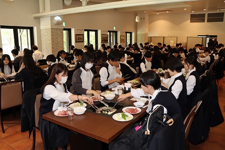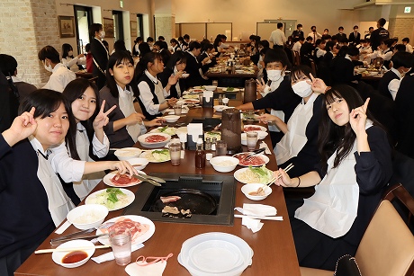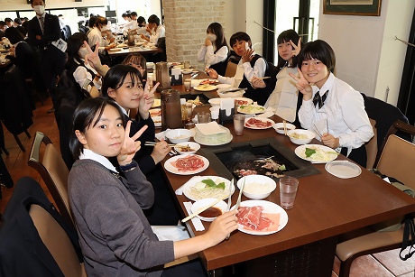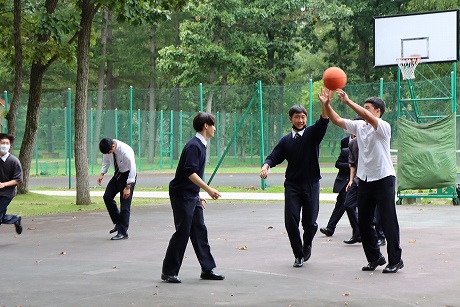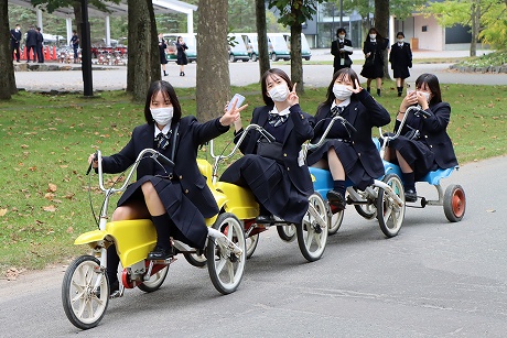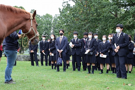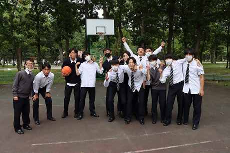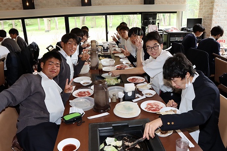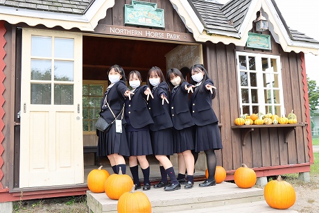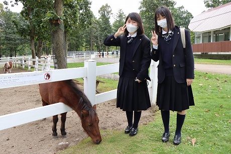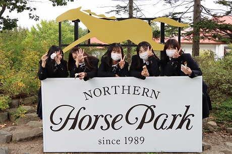 A班・B班ともに予定時間には新千歳空港に到着し、最初の目的地はノーザンホースパークです。昼食は北海道らしいジンギスカンで、男子生徒はもちろん、女子生徒もしっかり食べている様子でした。パーク内で生活している馬は約80頭で、引退した競走馬やポニーなど、性格も様々な馬たちと触れ合うことができます。男子生徒の中にはクラスでバスケットボールに汗を流し、クラス対抗で盛り上がり、元気いっぱいのプレーでした。女子生徒も連結自転車に乗ったりして、たくさんの思い出ができたようです。