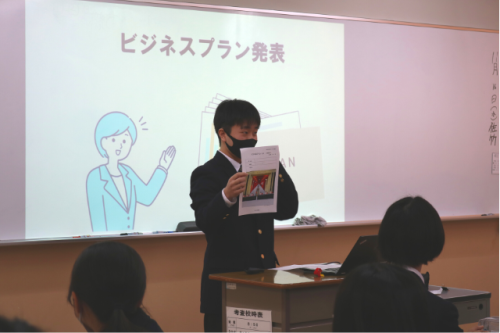 今回の校内ビジネスプランコンテストを実施するにあたって、生徒は日々の不満や「不便だ」、「もっとこういう風に改善したい!」といった出来事からビジネスのアイデアを生み出し、商品・サービスのデザインや収益を上げるための仕組みなどをグループで練り上げ、最後にそれをプレゼンとしてまとめて発表する、そういった実際に社会で行われているビジネスプランを仕上げる一連の流れに取り組みました。