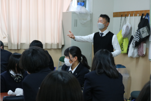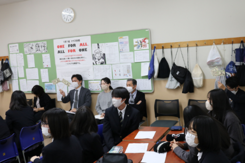 11月16日(水)の6校時、1年生特進Sコースの生徒を対象に、一般社団法人関西ニュービジネス協議会の副会長で、八戸ノ里ドライビングスクール 代表取締役でもある谷岡樹氏、株式会社MIWAIKEHATA 代表取締役の池端美和氏に講師としてお越し頂き、全6回のうち第5回目となる「16歳からの起業塾」というテーマの授業が行われました。