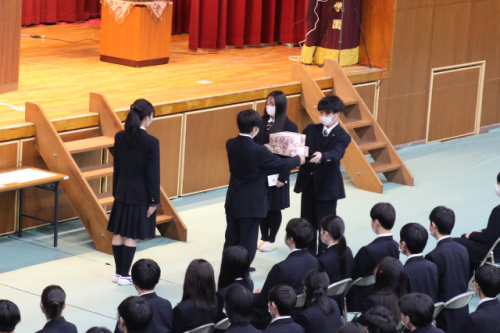卒業式が明日に迫った2月21日(火)、3年生を対象にした年度校長表彰・各種外部団体表彰があり、その後、在校生から卒業生への記念品の贈呈が行われました。また、全体の式終了後には、小会議室において熊見学園奨学金授与式も行われました。