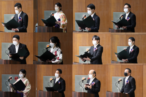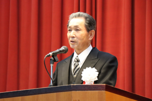 「皆さんが様々なことに興味と好奇心をもち、やりたいと思うことに「やればできる」の信念で前向きに挑戦し、新しい時代を生き抜いてください。」「どんなことにも感謝の気持ちを忘れずに、周りの人が幸福になるように、「社会で役立つ人間」になってください。」「松下幸之助さんの言葉より、人として比較して劣っているからといっても、決して恥ずることではない。けれども、去年の自分と今年の自分を比較して、今年が劣っているとしたら、それこそ恥ずべきことである。」「卒業生の皆さんが、日々努力し、成長し続け幸せな人生を歩まれることを祈念して、式辞といたします。」