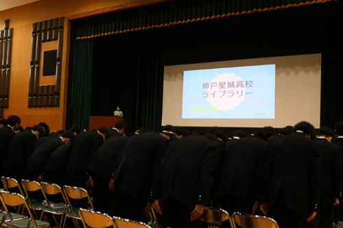 その後、教務部長からのお話がありました。義務教育が修了し高校生となったため、中学校とは違い、卒業するために必要な単位の話を中心に、生徒手帳の良志久に基づき、各先生方から学校生活についてのお話がありました。最後は5階のライブラリー(図書館)の利用方法や自学自習の仕方についても、司書の先生から説明がありました。