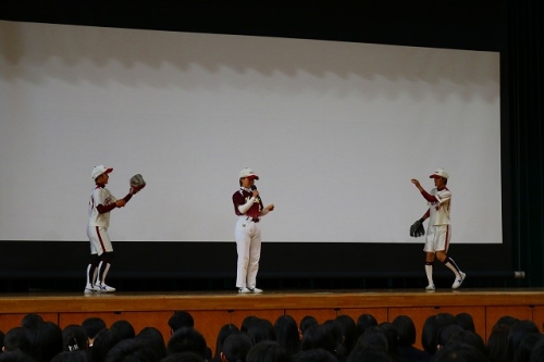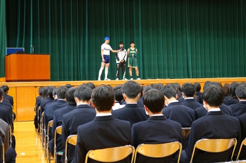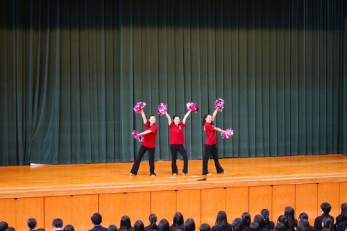 各クラブ代表者は一人でも多くの新入生に入部してもらおうと、楽器演奏やユニホーム姿で漫才など、工夫を凝らしての個性あるパフォーマンスを披露し、1年生はそれを見ながら夢を膨らませていました。いろいろなクラブに興味をもって、実際に体験をしながら自分に合ったクラブを見つけ、同じ目標を目指す仲間と共に活動に励み、充実した3年間にしてほしいと思います。