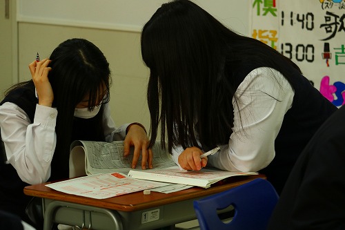 4月29日(土・祝)、特進Sコースの3年生は第1回全統共通テスト模試(マーク式)を受験しました。午前に社会と国語、午後には英語と数学、計4科目を受験しました。休憩時間には、生徒同士がお互いに問題を教え合う姿や、次の試験科目に向けた自習、問題を解き直す姿も見られ、試験終了後には各自自己採点を行いました。