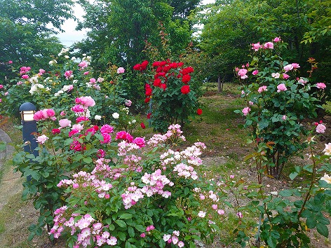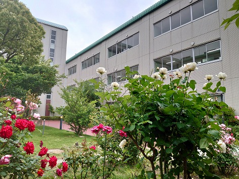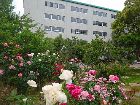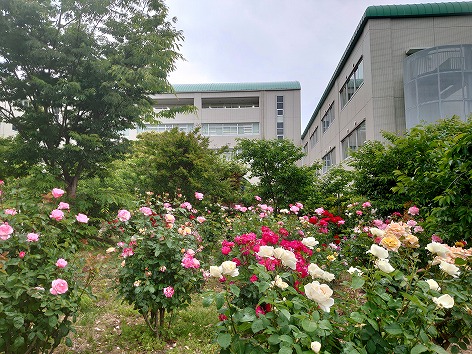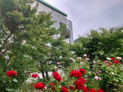 この時期、正面玄関前に広がる自彊園(中庭)にはバラがきれいに咲き始めています。