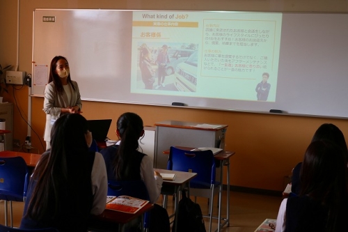 企業側が求める人物像、これからのAI時代で働くことの意義、社会人基礎力を培う必要性を説明していただき、生徒たちも積極的にノートにメモを取り、今後の就職活動を進める中で十分に活用できるように準備をしました。