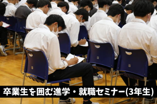 6月1日(木)、3年生の進学希望者は講堂で、就職希望者は大会議室で卒業生3名と本校職員による進路に関する「卒業生を囲む進学・就職セミナー」に参加しました。
