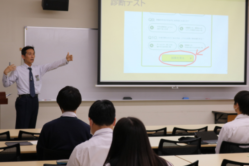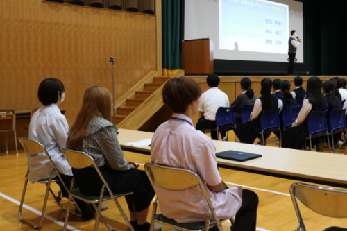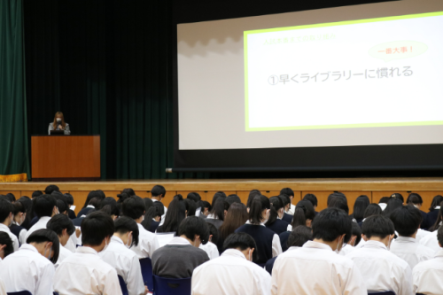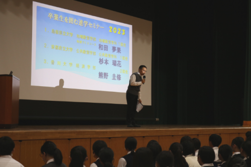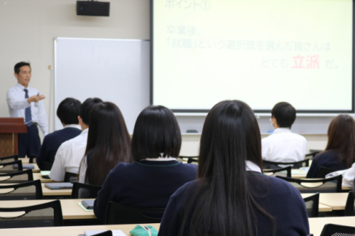 全卒業生がパワーポイントを使い、分かりやすく伝え、自分の言葉で感情を込めた話をしていて、卒業生の能力の高さに感心させられました。高校時代に頑張って良かったことや大学生になってはじめて気付いたことなど、卒業生の体験談は、3年生にとって今の自分の意識を高めるとともに、自分を変えるきっかけになりました。卒業生による進学セミナーは、昨年度まではコロナ禍のため、教室での映像視聴という形で実施していましたが、今年度からは対面での実施が叶いました。また就職セミナーでは、企業で勤務経験のある本校職員が語る就職に関する大切なことを聴きました。