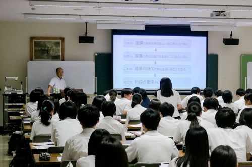 8月4日(金)、進学希望者の3年生、税について興味のある1・2年生を対象に「租税教室」を行い、100名弱の生徒が参加しました。実際に税理士の方に来ていただき、税収を上げるために自分だったらどうするか?など、自分が国の立場に立ち財政について考えるところから始まり、税の役割や歴史、税金の種類、そして最後には税理士の役割や仕事内容、公認会計士との違いなども講義していただきました。