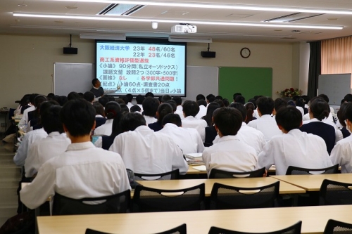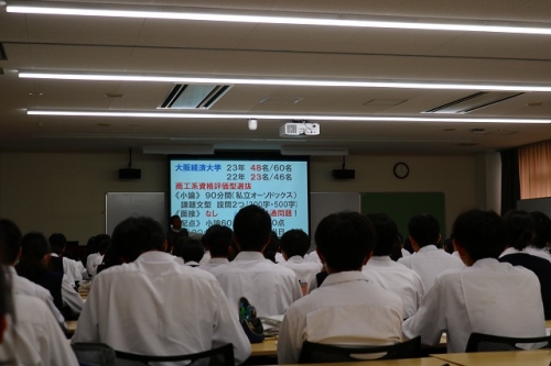 今回は近畿・京都産業・神戸学院・大阪経済・大阪商業・流通科学大学の6大学を中心に、入試日程や出願方法、昨年の実施状況について詳しく解説し、生徒はメモを取りながら真剣に耳を傾けていました。