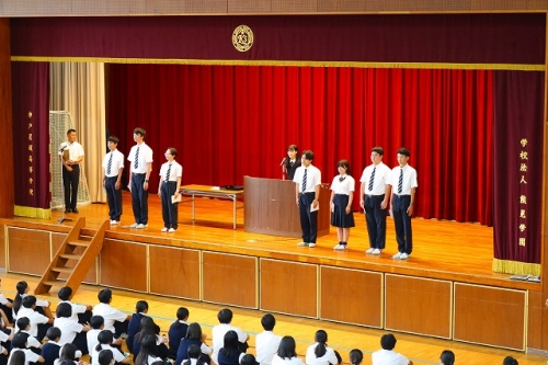 避難訓練では、「強い地震発生、その後カフェテリア厨房付近での火災発生」を想定し、体育館に迅速に、また安全に避難する訓練を実施しました。学級委員・生徒会役員任命式では、2学期の学級委員の任命、新生徒会役員の任命、そして旧生徒会役員への功労賞の授与が行われました。