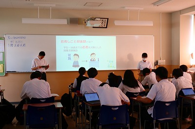 インターンシップで取り組んだことやインターンシップを通してわかったこと、これからの生活に活かしていきたいことなど、実際に体験しないとわからないことが多くあり、それらをプレゼンテーションという形式でまとめて発表し、生徒同士で互いに共有することでより社会について理解を深めました。