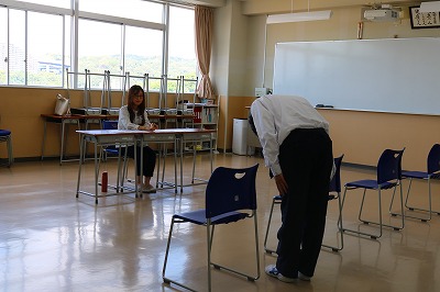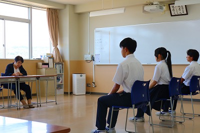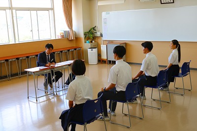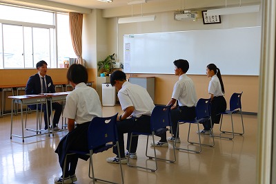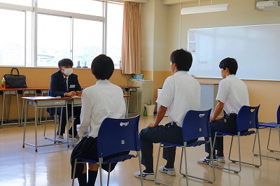 9月30日(土)午前中には、全コースの3年生の国公立大・私立大・専門学校などを志望する約170名を対象に、模擬面接会が実施されました。外部講師として面接のプロの先生方をお招きし、各教室に分かれて、一人2回ずつ本番を想定した面接練習を行いました。生徒たちは事前に作成した志望理由書などをもとに、本番さながらの雰囲気の中で、自分の言葉を使いながら、緊張感を持ってグループ面接に挑戦しました。入室から退室までの中で姿勢や身だしなみ、喋り方や受け答えなどについて面接後は15分程度の批評を受け、そのフィードバックをもとに自分の面接を振り返りました。