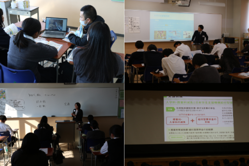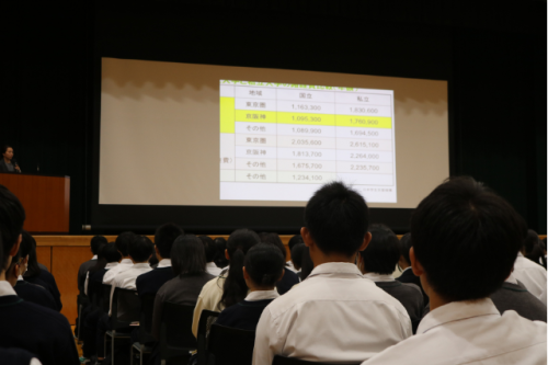 大学進学希望者対象の講話では、国公立大学と私立大学に進んだ場合、実家暮らしや一人暮らしの場合などに、どれくらい学費や生活費が必要になるのか、その違いなどについて具体的な話を聞くことができました。公立や私立の大学に比べて国公立大学は教員1人に対する学生の数が少なく、しっかりと指導を受けられるということや、入試に合格するために面接や小論文の指導をしっかり受けること、志望理由書の書き方などについて説明をしていただきました。