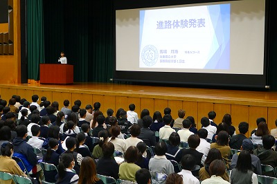 生徒会による「学校生活」「制服」の紹介があり、本校3年生の就職内定者と本校を卒業した現役大学生とが「進路決定に向けて取り組んだこと」を発表しました。その後、「なぜ、星城が商業高校から国公立大学への現役合格者数12年連続全国1位なのか」を徹底解説しました。