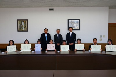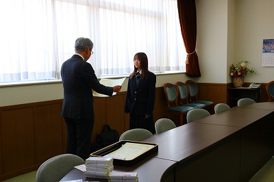 12月11日(月)、「税に関する高校生の作文」に応募した1年生の中から9名が優秀作品として選ばれ、本校小会議室で表彰式が行われました。表彰名、表彰者名等は下記の通りです。