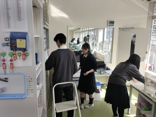 大学入学準備講座を午前中に終了し、昼食を終えた生徒たちが参加しました。小論文添削に面接練習と、日頃から指導してくださっている進学担当の先生方も参加しての清掃活動となりました。受験勉強中に使用したライブラリーなどの教室への感謝の気持ちを込めて取り組みました。掃除した後は、参加者全員で集合写真を撮って解散となりました。