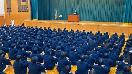 1月9日(火)、令和5年度3学期始業式を行いました。インフルエンザなどの感染予防も踏まえ、今回は3年生は講堂で、1・2年生は各教室で映像配信と校内放送を通して行いました。校歌に続き、校長先生から始業の言葉がありました。(一部抜粋)