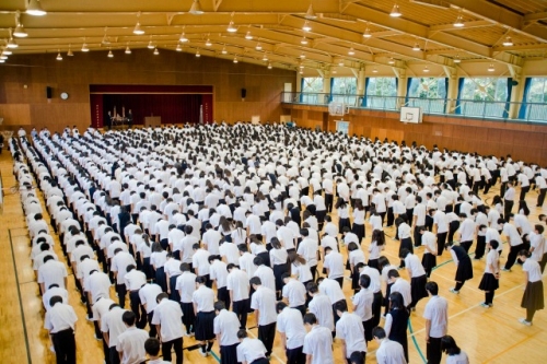 9月7日(木)、避難訓練・生徒会役員・学級委員任命式を行いました。避難訓練では、「震度5強の地震発生、その後、火災発生3号館2階カフェテリア厨房付近」を想定し、体育館に避難する訓練を実施しました。避難時に気をつけるべき点の「あ・さ・お・は・し」を注意し、地震発生から点呼完了までは9分03秒と生徒たちは昨年より2分ほど早く集合できました。
