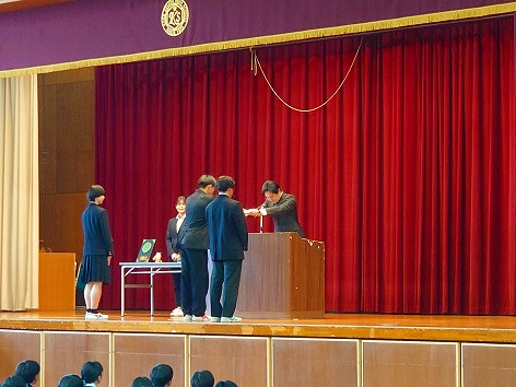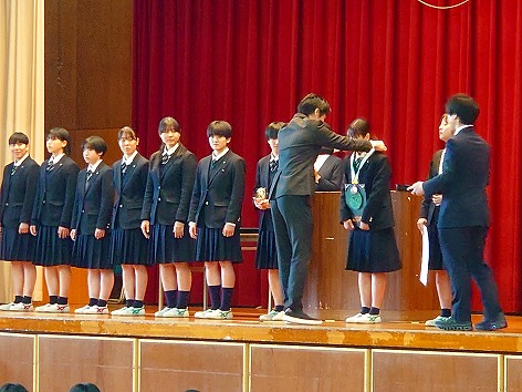 引き続き、表彰伝達が行われ、校長より以下の部活動および個人に表彰状やメダルが授与されました。