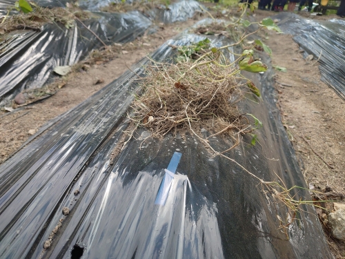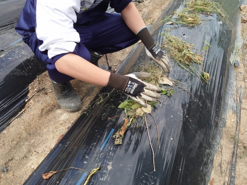 前回は「畝」にサツマイモの「定植作業」を行いましたが、直接サツマイモの苗がマルチに触れて傷んでしまう「マルチ焼け」を防ぐために、苗とマルチの間に草や砂を敷く作業を行いました。