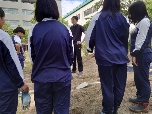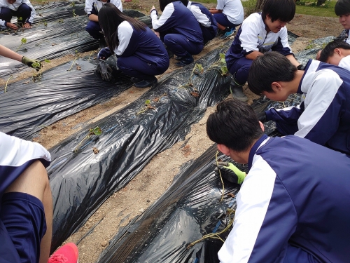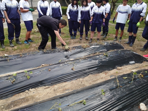 担当の先生から「兼業農家さんは、畑仕事とは別の仕事を持っていて、時間を見つけて農作業を行っています。だから、タイムリーに作業ができず、上手くできないときもあります。生徒の皆さんも授業や部活動などあり、限られた時間の中で作業をしなければいけません。兼業農家の方の立場で、どうすれば効率よく作業を進めることができるかを考えてほしい。」と授業の狙いを改めて説明していました。