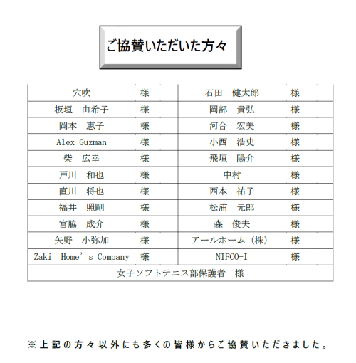 各方面から協賛金をいただき、本当にありがとうございました。一部の方にはなりますが、ご協賛いただいた方を掲載いたします。今後とも、本校の学校活動にご協力いただきますよう、よろしくお願いいたします。