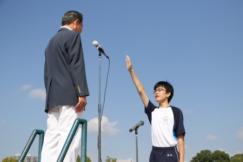 9月26日(火)、「おはようございます。本当にいいお天気になりました。体育大会の時こそ、健康の素晴らしさを考えてみてください。身体を動かし、運動を楽しむきっかけにしてほしいものです。つい先日も、桐生祥秀が日本人として初の100メートル10秒の壁を破りました。みなさんも記録を破る、挑戦する、普段の努力の積み重ねを大切にし、力を合わせ、自分たちの体育大会にしてください」との、校長先生の言葉で体育大会が始まりました。