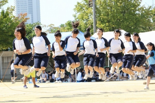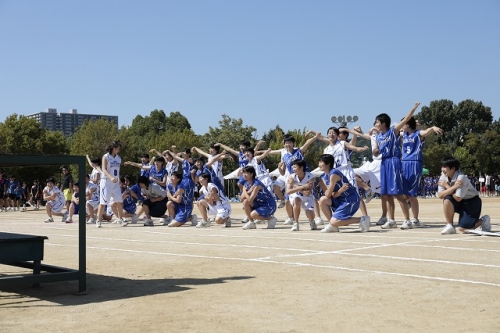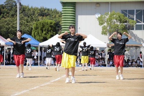生徒入場、国旗・校章旗掲揚で開会式の後、いよいよ演技が始まりました。準備体操に続き、最初のプログラムである女子ダンス部による笑顔いっぱいのダンス演技では大きな拍手が沸き起こり、良い雰囲気でスタートしました。白熱の棒引きに、笑い満載の障害物リレー、チームジャンプと学年・クラス対抗種目と続きました。