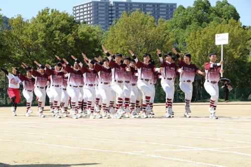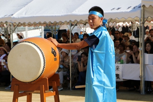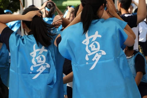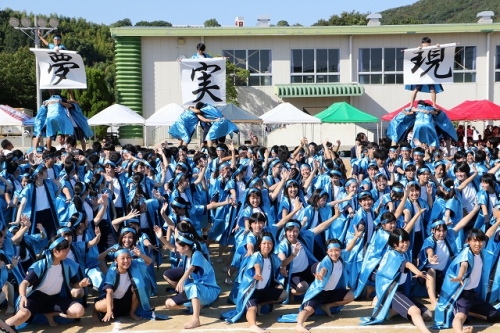 3年生の学年演技は、すっかり本校の名物になった「ソーラン節」です。3年生男女全員、学年カラーの青いハッピの背中には「夢」の文字が輝いていました。最後に四つのピラミッドの上から「ほしろん(本校のキャラクター)・夢・実・現」の垂れ幕が掲げられ、多くの声援や拍手が沸き起こり、最高潮の盛り上がりでした。