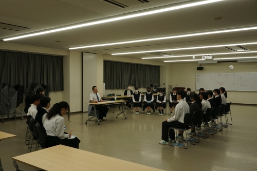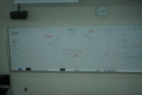 講師の方が面接官役をし、それに答える生徒、次に面接を控える生徒、面接を評価する生徒に分かれて行いました。