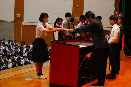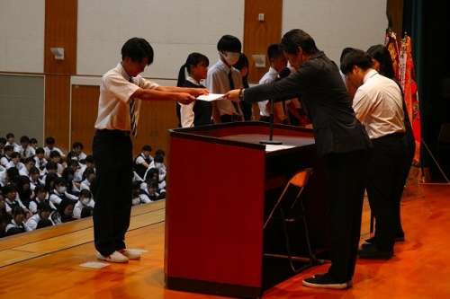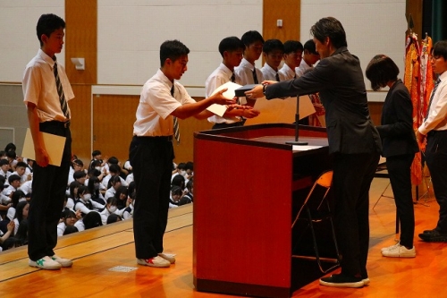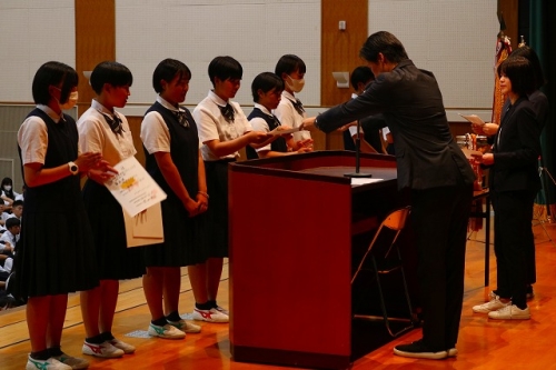 7月17日(水)、1学期終業式に引き続き表彰伝達式・部活動壮行会を行いました。表彰伝達式では各クラブ・個人の健闘に対し、校長から表彰がありました。