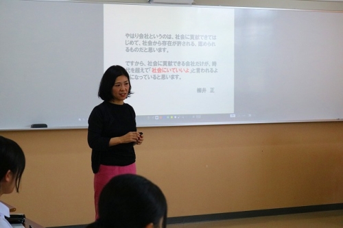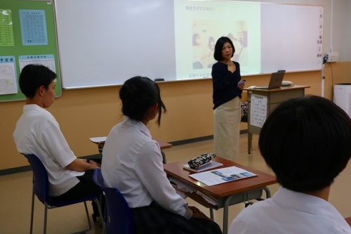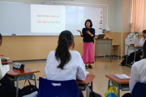 株式会社MIWAIKEHATA代表取締役の池端美和(いけはた・みわ)氏に講師としてお越しいただき、1年生特進Sコースの生徒に授業を行っていただきました。