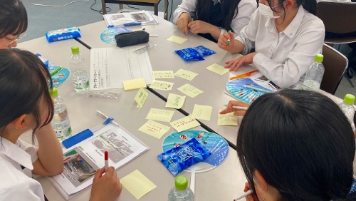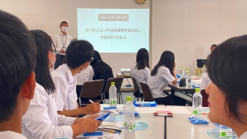 見学後は「カーボンニュートラルを実現するために、今日からできること」について7つのグループでディスカッションを行い、発表しました。どのグループも意見交換しながら多様な考えを付箋に書き出し、ワークシートにまとめていました。
