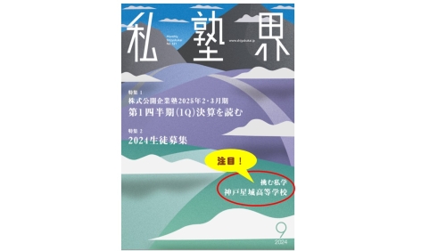 月刊『私塾界』9月号に掲載されました‼ ■2024-09-18 写真は、自動的にスライド表示されます (ドラッグしてスライドも可) 神戸星城高校が、月刊『私塾界』2024.9月号に掲載されました‼ 本校校長が紙面いっぱいに「S28プロジェクト」や「マンツーマン指導」など、星城の魅力を語っています。 神戸星城高校に少しでも興味・関心のある中学生および保護者の皆さまは、ぜひ本校オープンスクールにご参加くださいね。 「夏のオープンスクール」とは違って、星城の魅力がもっとわかる「オープンスクール」が目白押しです! 「秋のオープンスクール」への申込みはこちら、 「特進Sコース説明会&本音トーク」への申込みはこちら、 「地域別学校説明会」への申込みはこちら