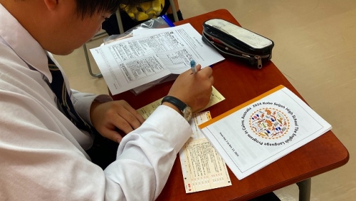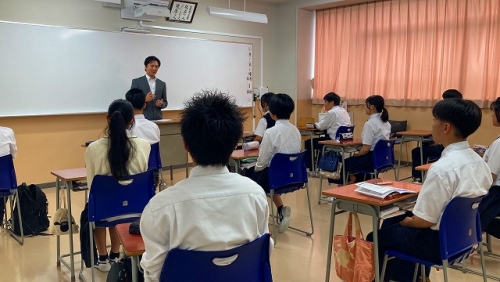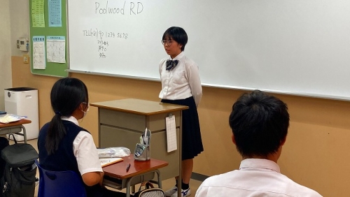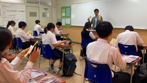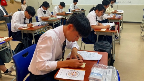 結団式では校長先生のお話から始まり、日本旅行の方からの諸注意や必要書類の確認等が行われました。また、代表生徒による宣誓や学年主任の先生、特進Sコース責任者の先生からのお話もありました。生徒たちは、先生方や代表生徒の言葉に奮い立たされ、より一層、語学研修に向けての士気が高まりました。