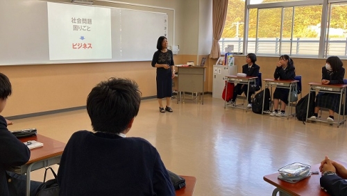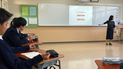 11/13(水)特進Sコースの1年生が経営者の方からの授業を受講しました。全7回のうち第5回目となる今回は、社会問題や困りごとから”ビジネスプランの種”を見つけるため、マーケティングの考え方や商品の機能的価値、情緒的価値についてレクチャーしていただきました。