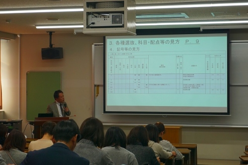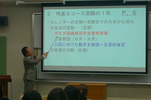特進Sコースの責任者と学級担任より、大学進学にあたっての様々な入試制度についての説明、特進Sコースからの受験方法や国公立大学を選ぶメリットなど、これから本格的に取り組む進学について具体的な内容をお話ししました。