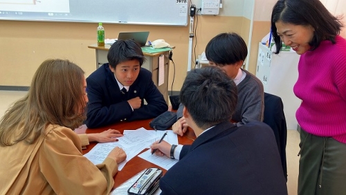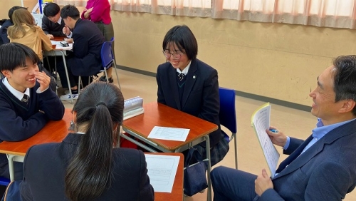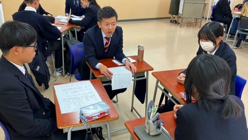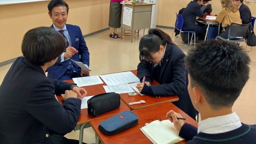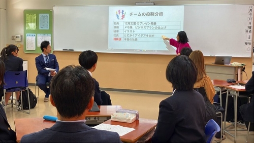 本日、特進Sコースの1年生が経営者の方による授業を受講しました。第6回目となる今回は、現役の経営者の方4名にお越しいただき、グループに分かれてビジネスプラン作成においてのアドバイスをいただきました。
