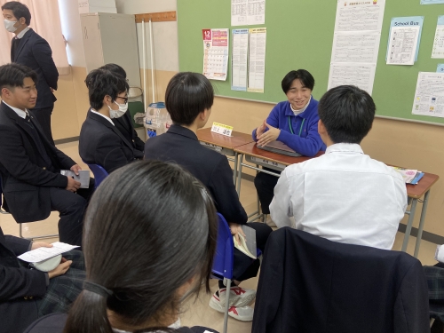 今回は、筑波大学、横浜国立大学、関西学院大学、関西大学に通う4人の卒業生が本校まで足を運んでくれました。これから進路に向けて取り組むべきことや自身が意識していたこと、志望校に合格するための勉強方法など、自らの経験談を交えながら語ってくれました。それぞれプレゼンテーションの後、卒業生ごとにブースを作り、生徒は4グループに分かれて直接質問などをしながら話を聞きました。