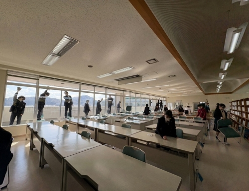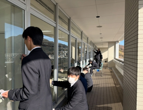 大学入学準備講座を午前中に終了し、昼食を終えた生徒たちが参加しました。小論文添削に面接練習と、日頃から指導してくださっている進学担当の先生方も参加しての清掃活動となりました。受験勉強中に使用したライブラリーなどの教室への感謝の気持ちを込めて取り組みました。掃除した後は、参加者全員で集合写真を撮って解散となりました。