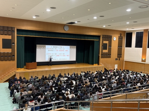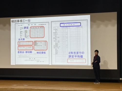 本校講堂では「進学」について、大会議室では「就職」について各資料をもとに、卒業後の進路実現における生徒・保護者の具体的な動きや考え方などについて、2つに分かれて説明を行いました。