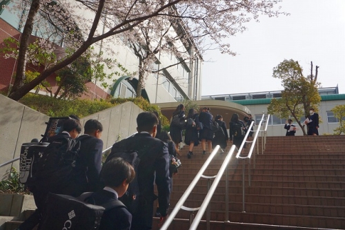 4月8日(火)、真新しい制服に身をつつんだ新入生が元気よく登校してきました。教職員が拍手で迎える中、学級担任の先生の引率で新入生425名が体育館に入場し、入学式が始まりました。